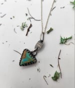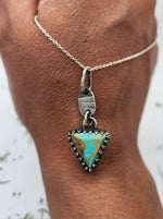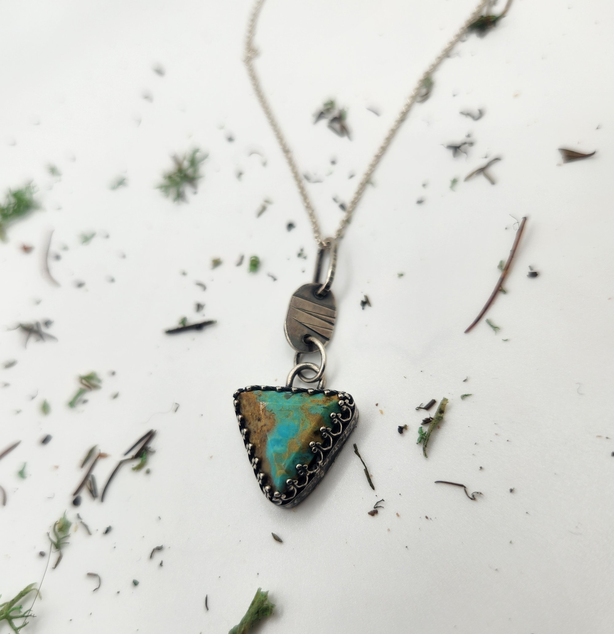 This petite triangle pendant features a natural Turquoise, cut and polished by hand. Small, subtle, and timeless!