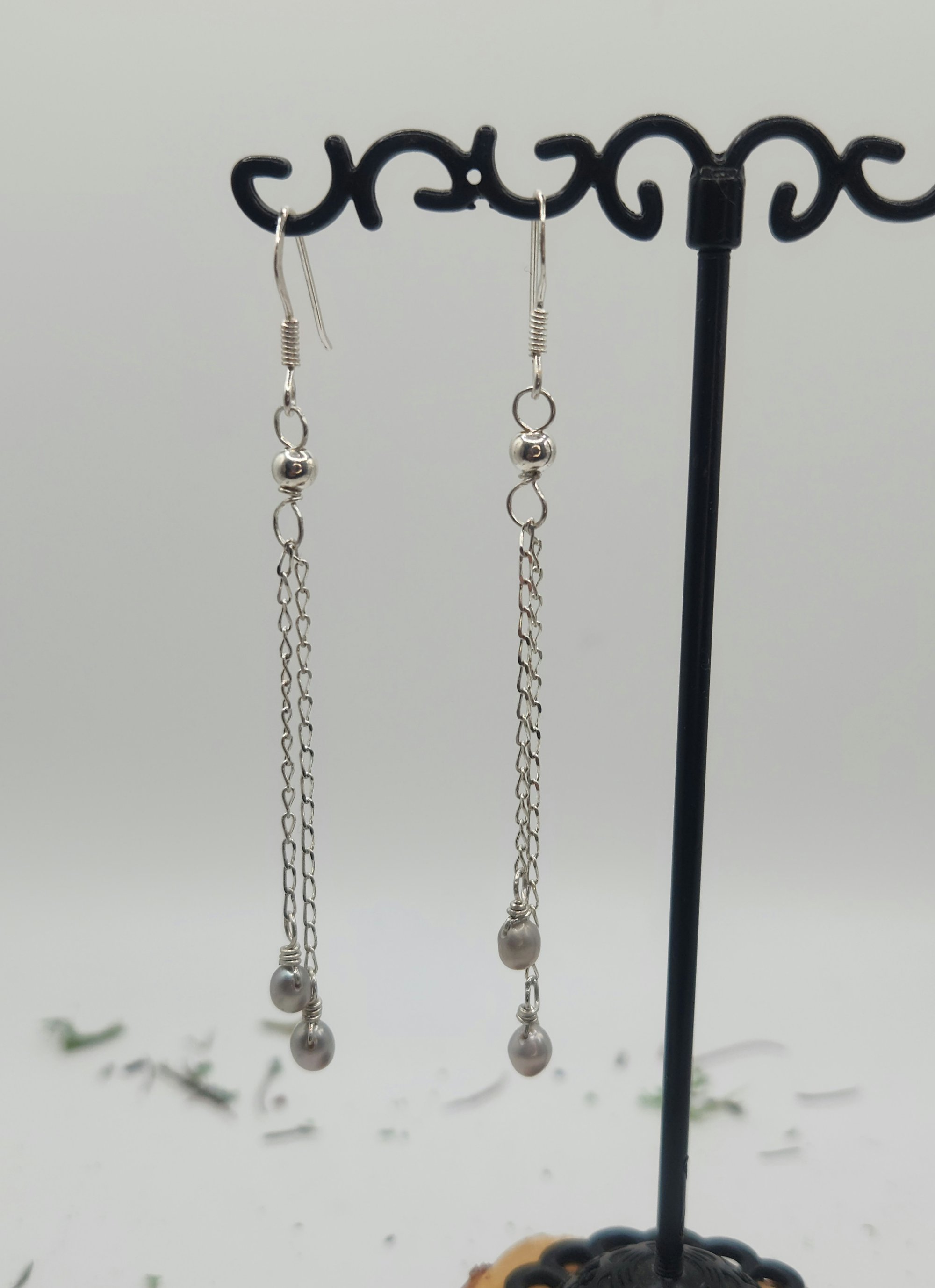 These twin-chain earrings feature soft natural freshwater grey pearls suspended from delicate silver links. Their design evokes a whisper of Victorian charm—where pearls symbolized purity and refinement. They’re perfect for adding subtle sophistication and elegance to any look.