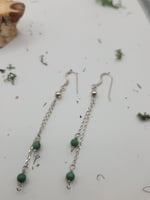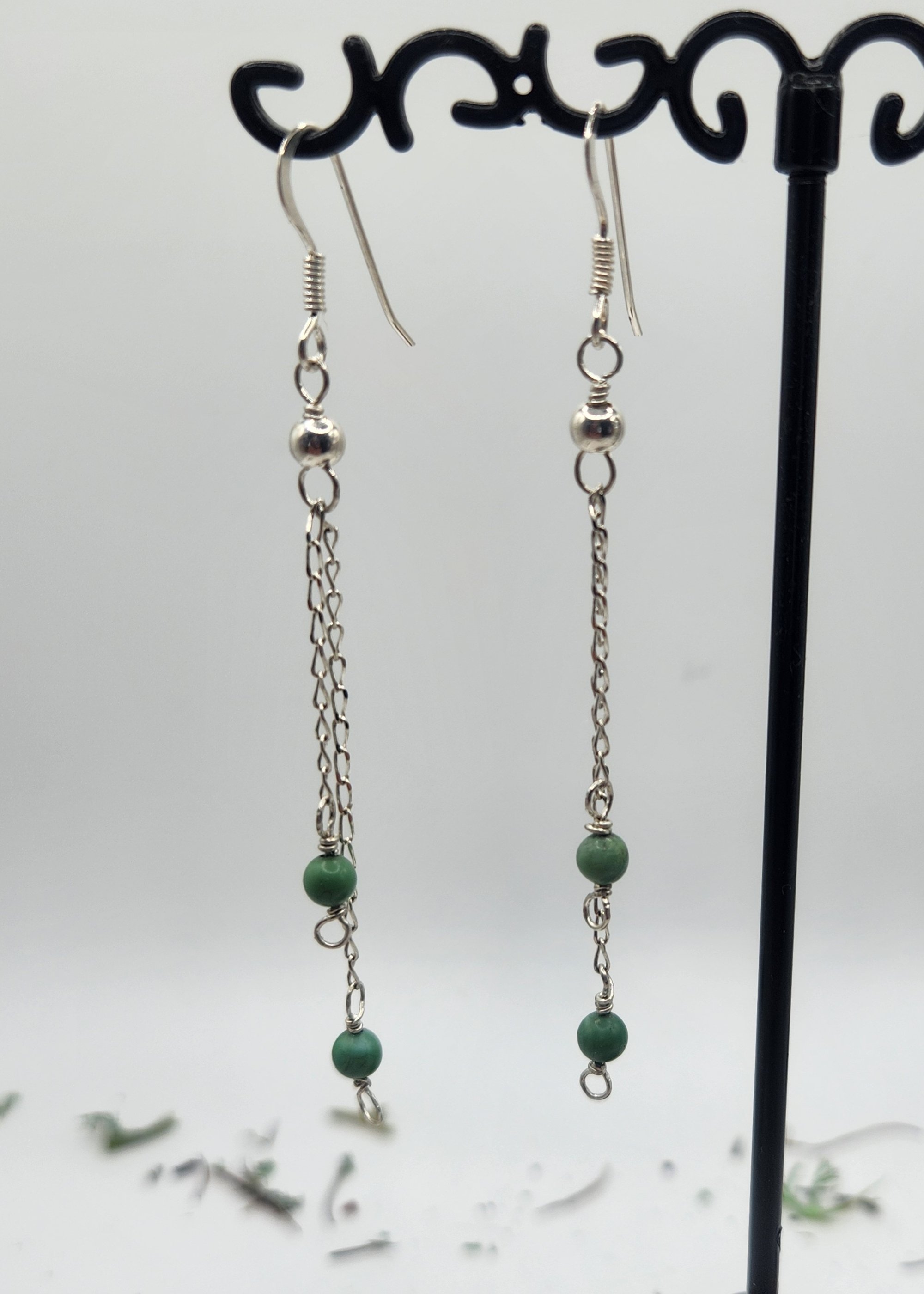 These twin silver chains fall in perfect harmony, each ending with a blue/green-natural turquoise bead (3.5 mm). They have a touch of bohemian and minimalist jewelery. These earrings bring a subtle whisper of color and timeless charm to any look.
